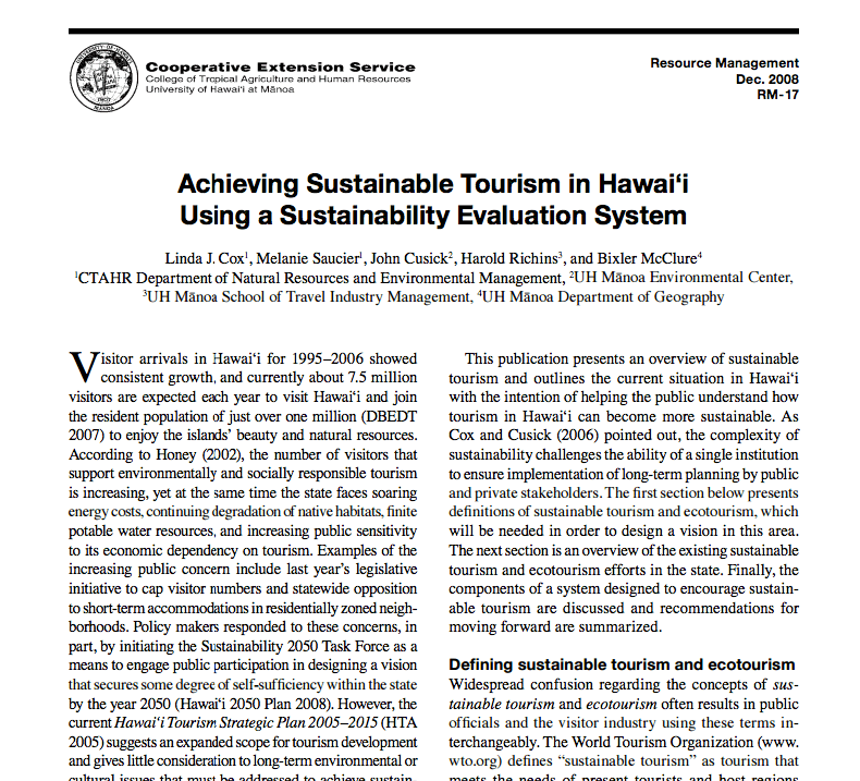 Achieving Sustainable Tourism in Hawaii using a Sustainability Evaluation System